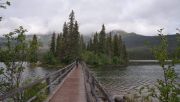 Am Morgen regnet es noch, so dass ich es etwas langsamer angehen lasse. Als Erstes fahre ich zum Pyramid Lake hoch, der hier gleich hinter Jasper liegt und in zehn Minuten zu erreichen ist. Ich gehe ein paar Schritte auf Pyramid Island, einer kleinen Insel, die über einen Steg zu erreichen ist und von der es schöne Ausblicke gibt, die heute Morgen noch alle wolkenverhangen sind.