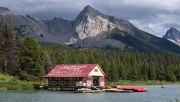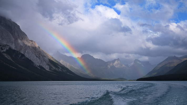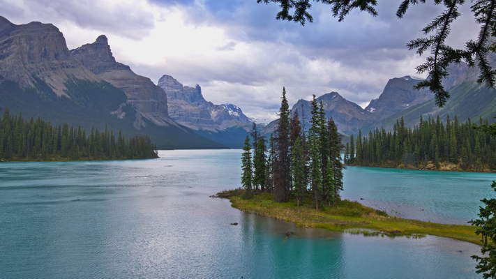 Dann ist es so weit, dass am frühen Abend meine Bootstour startet. Ich hatte extra diese Tour gewählt, damit die Sonne entsprechend richtig steht, wenn ich an Spirit Island bin und Bilder machen will. Der Wetterbericht hat auch Entsprechendes vorhergesagt, aber es kam anders. Zu Beginn der Bootstour, die über den halben See führt, hat es zugezogen und als wir dort angekommen sind, hat es angefangen zu regnen. Glücklicherweise konnte man die Berge und deren Gipfel im Hintergrund noch erkennen, so dass nicht alles im Nebel versank, aber es hat einfach das Licht gefehlt. Die Gletscher und auch die Bergmassive, die vom See aus zu sehen waren, bildeten eine beeindruckende Kulisse. Unser Stopp an Spirit Island, die für die Ureinwohner Kanadas eine heilige Stätte ist, war dann auch entsprechend. Die Insel und der Blick auf sie mit den Bergen im Hintergrund sind schon ein besonderes Motiv mitsamt der Farbe des Sees.