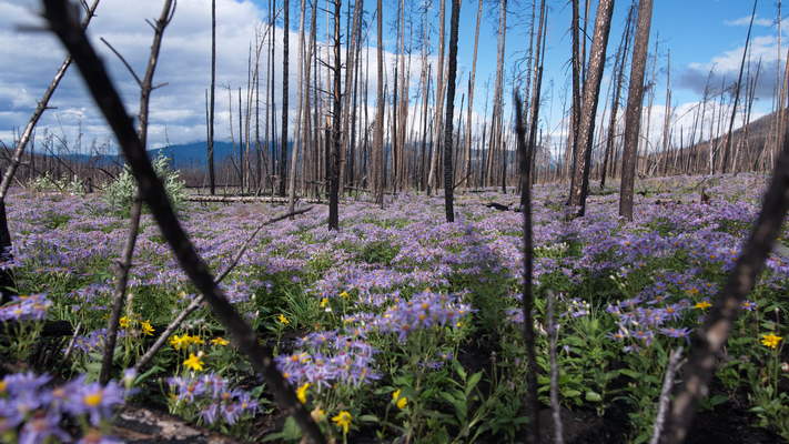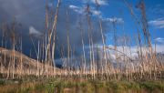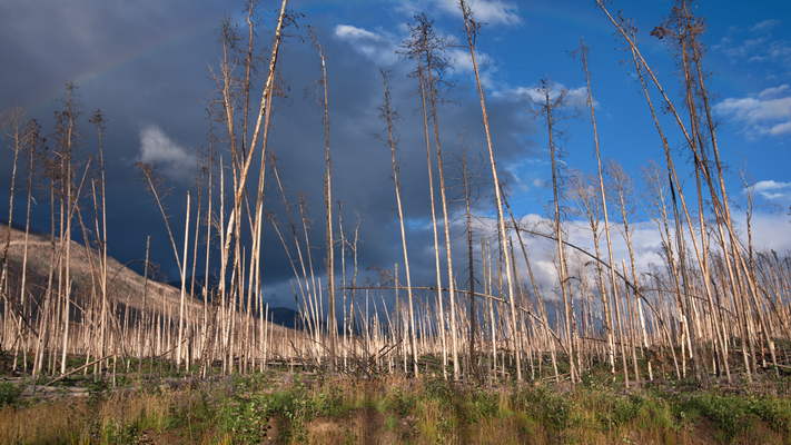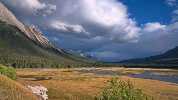 Dann fahre ich wieder zurück und weiter zu meinem eigentlichen Ziel, dem Maligne Lake, auf dem ich eine Bootstour zur berühmten Spirit Island gebucht habe. Als ich auf die Straße zum See abbiege, mache ich einen Stopp am Maligne Outlook und schaue hinunter in das Athabasca-River-Tal, in dem auch Jasper liegt. Der Ausblick ist ungetrübt, da der Waldbrand von letztem Jahr hier alles niedergebrannt hat und sich auch das Wetter aufgeklart hat. Das ist auch der Grund, warum man den Maligne Canyon nicht besichtigen kann. Nach einem kurzen Überblick fahre ich weiter und komme am Medicine Lake vorbei. Der Blick über den See ist gar nicht so spektakulär, dafür aber sein stark schwankender Wasserspiegel. Denn er ist sozusagen undicht und verliert große Mengen an Wasser am Grund in das Karstgestein, so dass im Winter durch abfließendes Wasser der See fast leerläuft und im Frühjahr und Sommer sich der Wasserstand erhöht, weil mehr zu- als durch die „Löcher“ abfließt. Also das gleiche Prinzip wie bei der Donauversickerung.
