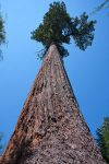 Am Nachmittag haben wir uns dann zum Lonely Doug aufgemacht, einem Küstenmammutbaum, der bei einer Abholzaktion aufgrund seiner Größe und seines Alters stehen geblieben ist. Dazu müssen wir einige Kilometer mit dem Auto fahren und werden durch eine Schlaglochpiste ziemlich ausgebremst. Zwischendurch dachten wir schon, dass wir mit unserem kleinen blauen Auto nicht durchkommen, da das Auto keine große Bodenfreiheit besitzt. Wir kommen nach einer Dreiviertelstunde an dem Abzweig an, an dem es nur noch mit einem Allradfahrzeug weitergehen würde. So stellen wir das Auto ab und machen uns zu Fuß auf die letzten zweieinhalb Kilometer. Dann erreichen wir den kleinen Pfad, der zum großen Baum führt. Abgeholzt wurde die Fläche vor 14 Jahren, sodass heute bereits wieder dichter Bewuchs vorhanden ist. Das heißt aber auch, dass der Blick auf den Riesen nicht mehr so frei ist, wie man es sich wünschen würde. Es ist aber trotzdem sehr eindrücklich, neben dem riesigen Stamm zu stehen und die Krone in rund hundert Metern Höhe zu sehen.