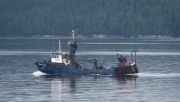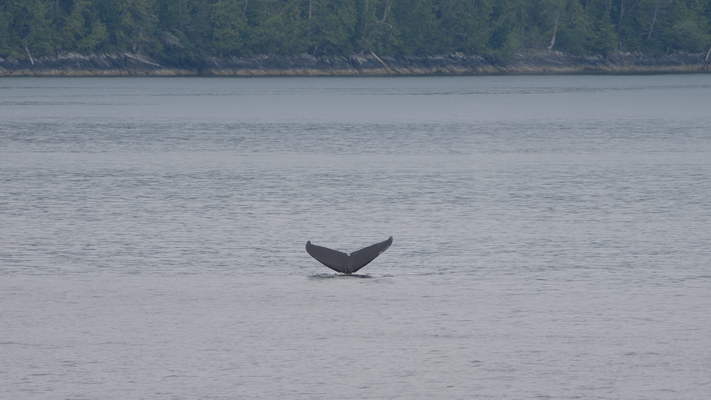 Die ersten Stunden verbringen wir unter Deck und schauen alte Fotos an. Als es aufklart und nur noch tiefhängende Wolken gibt, gehen wir an Deck und schauen uns um. Dabei sehen wir Buckelwale im Fritz-Hugh-Sound. Sogar eine größere Gruppe von geschätzt 8–10 Tieren. Sie sind für gute Fotos aber zu weit entfernt, können sie jedoch trotzdem gut sehen. Wenig später erkennen wir Buckelwale sehr weit voraus, die tatsächlich springen. Als wir dann schließlich auf Höhe der Wale sind, tun sie das leider nicht mehr.