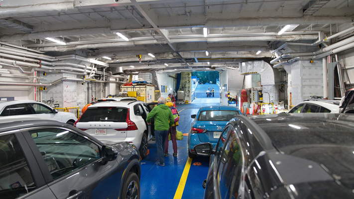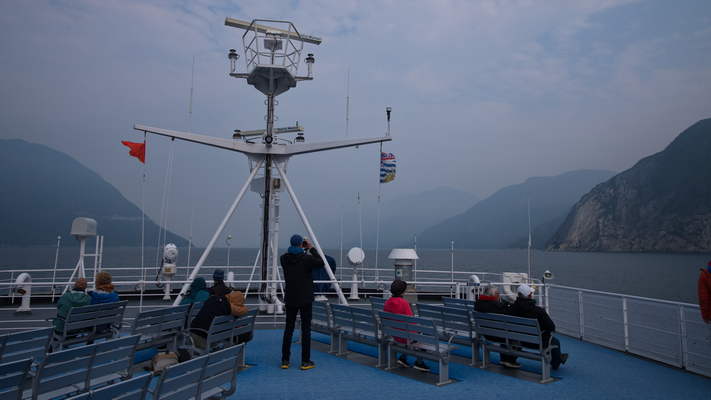 Es geht sehr früh aus den Federn, denn wir müssen die Fähre nach Bella Coola erreichen. Dazu müssen wir zwei Stunden vor Abfahrt da sein. Die Fahrt wird zehn Stunden dauern. Es ist glücklicherweise nicht weit von der heutigen Unterkunft und so stehen wir pünktlich in der Dunkelheit am Terminal und warten dann auf das Laden. Es ist mal wieder ziemlich nebelig, als wir auf die Fähre dirigiert werden. Ungewöhnlich ist, dass wir uns auf dem Deck umdrehen müssen beim Laden, da die Fähre nur eine Luke hat. Aber das Schiff ist überraschenderweise nicht ausgebucht, was wohl an den Waldbränden und dem Risiko einer gesperrten Straße liegt. Wir haben eigentlich keine Wahl und vertrauen darauf, dass die einzige Verbindungsstraße zurück nach Vancouver passierbar bleibt.