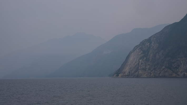 Je näher wir Bella Coola kommen, desto wolkenloser wird es, aber gleichzeitig nimmt auch der Rauch in der Luft von den vielen Waldbränden so stark zu, dass man die Berge kaum noch sehen kann. Es lässt sich aber erahnen, wie schön dieser Fjord bei klarer Luft sein muss.