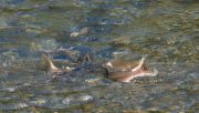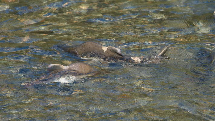 Wir fahren die Straße runter und finden den Saloompt River, halten an einer Brücke und schauen, ob es Bären beim Fischen von Lachs gibt. Als ich den Kofferraum aufmache, stelle ich fest, dass ich den Kamerarucksack in der Unterkunft vergessen habe, obwohl ich extra noch einen Ersatzakku in die Hosentasche gesteckt hatte. Super, ich fahre zurück und hole ihn, Beate bleibt da. Als ich zurückkomme, sind auch noch keine Bären zu sehen, obwohl es jede Menge Lachse im Wasser gibt. Wir warten und gehen den Fluss noch ein Stück hinauf, aber es tut sich nichts.