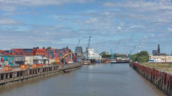 Die Fähre verpasste ich knapp, sodass ich relativ lange warten muss. Dafür ist die Strecke auf der nördlichen Seite toll und ich schau mir auch noch das Dogland-Gebäude an. Woran ich bisher immer nur vorbeigefahren bin. Man hat eine tolle Aussicht vom Dach aus auf den Hafen und die Elbe.