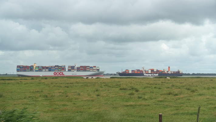 Dann geht’s weiter hinter den Deich nach Neuhaus. Anschließend fahre ich einen kleinen Umweg und fahre an den Deich, schaue mir kurz den historischen Leuchtturm Balje an und mache dort eine längere Pause, weil auf der Elbe sechs riesige Containerschiffe zu sehen sind. Was für eine große Anzahl! Als ein 400-m-Pott von OOCL auf meiner Höhe ist, begleite ich das Schiff elbabwärts und kann es in der nächsten halben Stunde knapp hinter mir lassen, als ich, angeschoben vom Wind, in Rekordgeschwindigkeit vorankam.