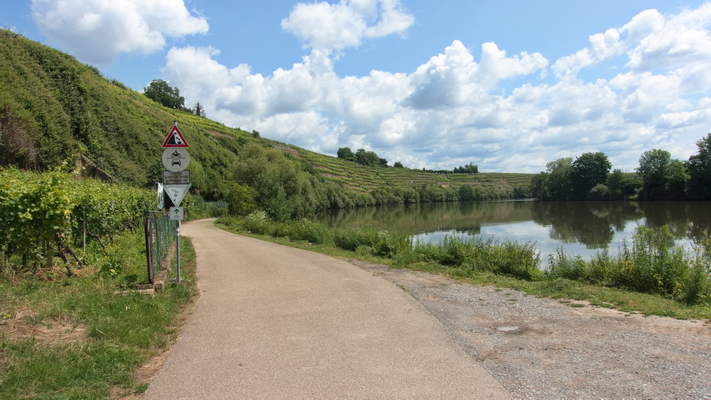 Zuerst radle ich das Glemstal hinunter, um auf dem Weg an den Neckar ein paar Kilometer abzukürzen. Vom gestrigen Regen ist der Weg noch recht feucht und es sind laufend Pfützen zu umfahren. Der naturbelassene Abschnitt der Strecke ist recht schlammig, aber ich komme gut durch und erreiche bei Unterriexingen die Enz. Nun folge ich dem Enztalradweg, an Bietigheim vorbei, bis zur Mündung in Besigheim. Zwischendurch muss ich noch einen kleinen Umweg in Kauf nehmen, weil der Radweg gesperrt ist. So ist der Neckar recht zügig erreicht. Dabei kommt es mir noch gar nicht so vor, als würde ich auf eine große Reise gehen, sondern eher wie ein Sonntagnachmittagsausflug.