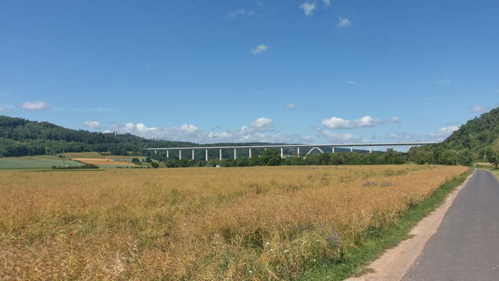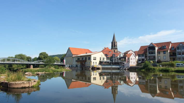 Es hat abgekühlt heute Morgen. Es ist sehr angenehm, als ich losfahre. Ich mache gleich noch einen Stopp bei einem Bäcker und kaufe zwei belegte Brötchen als Verpflegung. Dann such ich den richtigen Weg zurück zum Fuldatalradweg. Ich muss ihn aber irgendwie verpasst haben, denn ich befinde mich neben der Hauptstraße, der ich nun folge, weil die Richtung stimmt. Das Gute daran war, dass ich an einem Getränkemarkt vorbeigekommen bin und dort meine leeren Flaschen gegen volle tauschen konnte. So bin ich wieder versorgt. Wenig später gibt es dann einen Übergang über die Straße und die Bahnlinie, so dass ich wieder weg von den Autos auf dem Talradweg bin. Mein nächstes Ziel ist Rotenburg an der Fulda, was ich mir heute anschauen möchte.