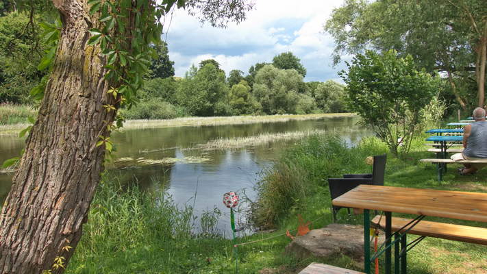 Bei zunehmendem Wind radle ich weiter und überlege mir, weil der Wind hauptsächlich von hinten oder von der Seite weht, vielleicht doch noch, bis Kassel weiterzufahren. Aber nach einem kurzen Zwischenstopp in einem Biergarten entscheidet das Wetter, dass ich in Guxhagen Quartier nehme. Ich hoffe, noch vor dem Gewitter die drei Kilometer zur Unterkunft zu schaffen, welche ich noch schnell telefonisch reserviert hatte. Aber es ist zu spät. So probiere ich unter einer Brücke meine Regenklamotten an und aus. Es geht sehr gut. Vor allem die Gamaschen zum Schutz der Schuhe sind sehr hilfreich. Als ich ankomme, lässt es auch schon wieder nach und fängt anschließend auch nicht wieder an zu regnen. So hätte ich nach einer Pause wohl doch noch nach Kassel fahren können. Aber hinterher ist man immer schlauer.
