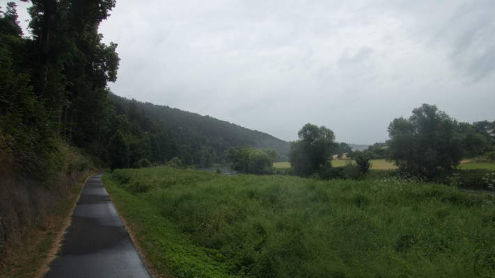 Ich stülpe wieder meine Regenklamotten über und fahre weiter. Es ist leichter Landregen, aber er hört über die ganze Strecke bis Hannoversch Münden nicht auf. Deshalb mache ich keine Pause, auch wenn die Strecke sehr schön ist. Der Vorteil ist, dass kaum andere Radler unterwegs sind und ich die Strecke für mich alleine habe.