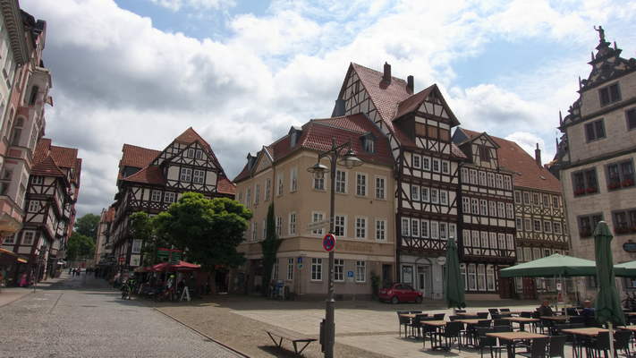 Das Wetter trübt sich wieder ein und es wird auch kühler. Aber es fängt nicht an zu regnen, worüber ich froh bin. Ab Hannoversch Münden verläuft der Radweg fast ausschließlich neben der Straße entlang, was nicht so schön ist, aber wohl dem engen Tal geschuldet ist. Landschaftlich kann man nicht meckern. Es ist ein eng geschnittenes Tal und man fährt die ganze Zeit neben dem Fluss entlang. Die letzten Kilometer sind nochmals anstrengend, weil ich kräftigen Gegenwind habe. Aber dann ist es geschafft. Ich checke ein, nehme eine Dusche und ziehe warme Klamotten an, um mir das Städtchen anzuschauen, bevor ich was essen gehe.